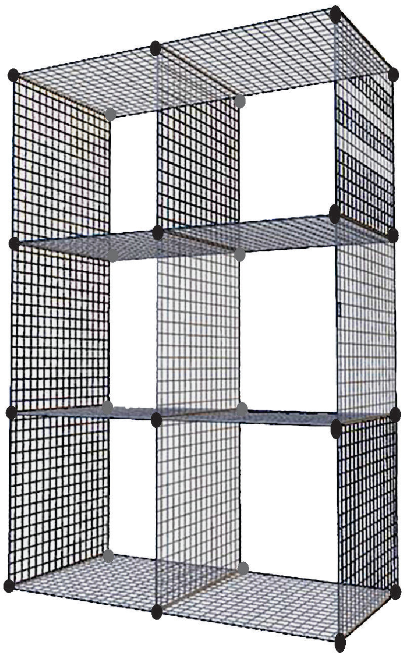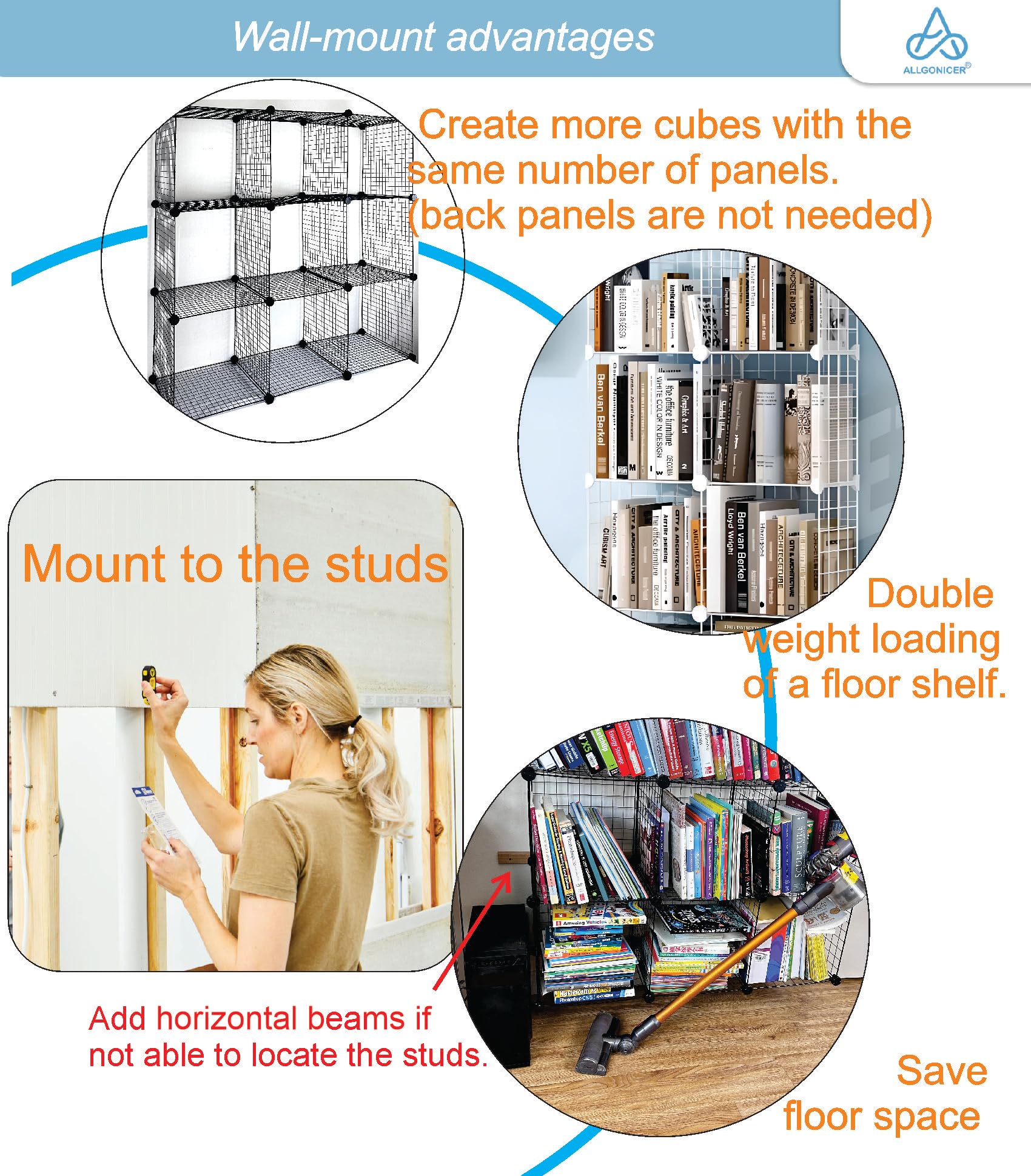 - DIY assemble wire grid panels into multiple cube storage racks. Interlocked 16" cubes can be mount onto standard 16" apart wall studs. Back panels are not needed. Economic alternative to floor standing racks.